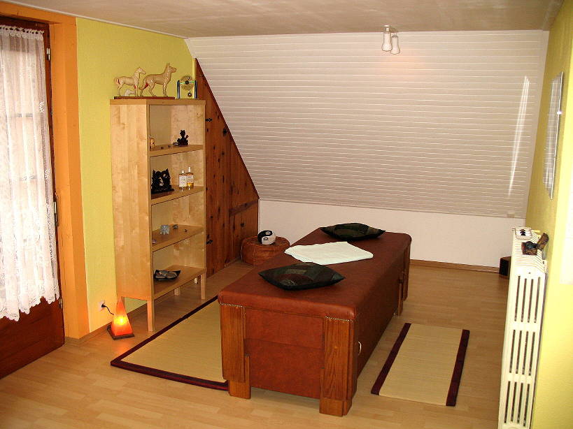 La salle de massage avec la table de massage en bois massif au centre de la pièce dans les locaux du Centre de l'Harmonie à Steinsoultz.
