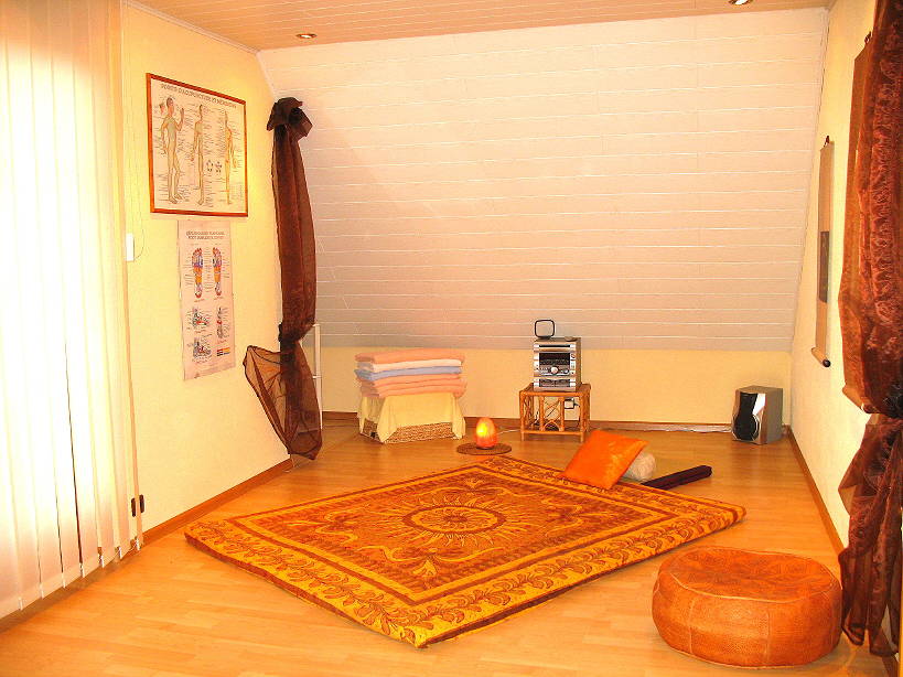 La salle de relaxation aux couleurs jaunes, oranges et brunes qui créent une atmosphère chaleureuse au Centre de l'Harmonie à Steinsoultz.