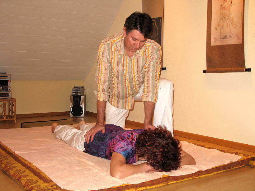 Patrice Jasinski applique une relaxation du dos sur une cliente dans les locaux du Centre de l'Harmonie à Steinsoultz.