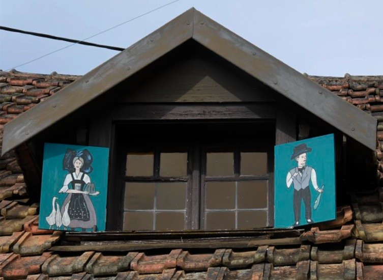 - Le chien assis de la Maison Alsacienne d'Écoute la Rivière avec une Alsacienne sur le volet gauche et un Alsacien sur le droit à Waldighoffen.