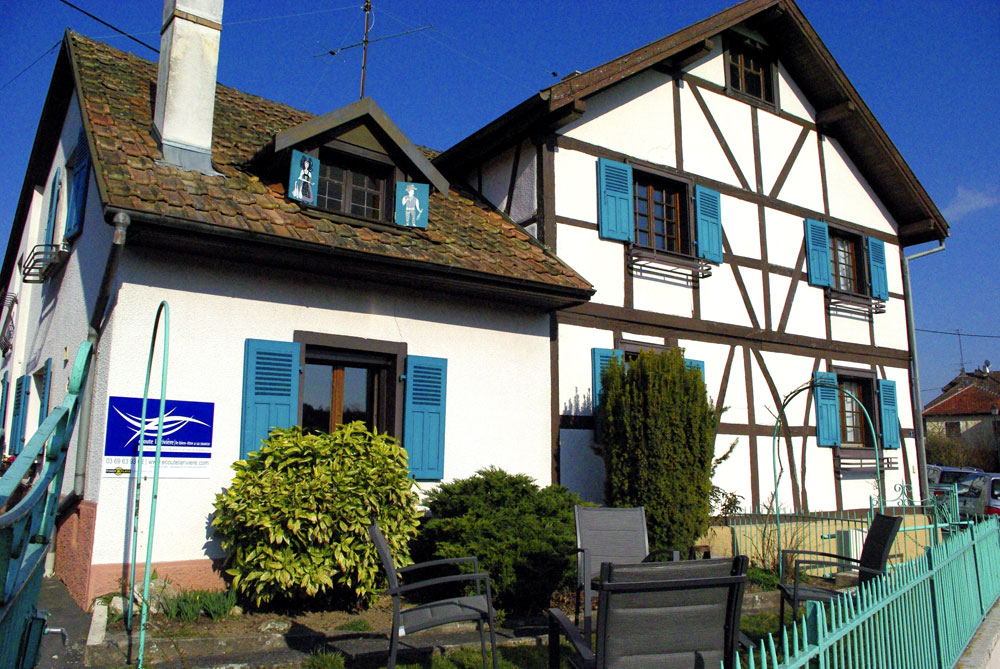 - La maison d'Écoute la Rivière à Waldighoffen est une maison alsacienne à colombage avec des volets bleus.