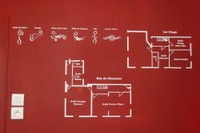 - Le plan de situation blanc sur un mur rouge du centre de coaching sportif Écoute la Rivière à Waldighoffen.