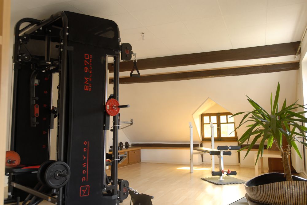 Une grosse machine professionnel et un petit banc de musculation chez Écoute la Rivière à Waldighoffen.