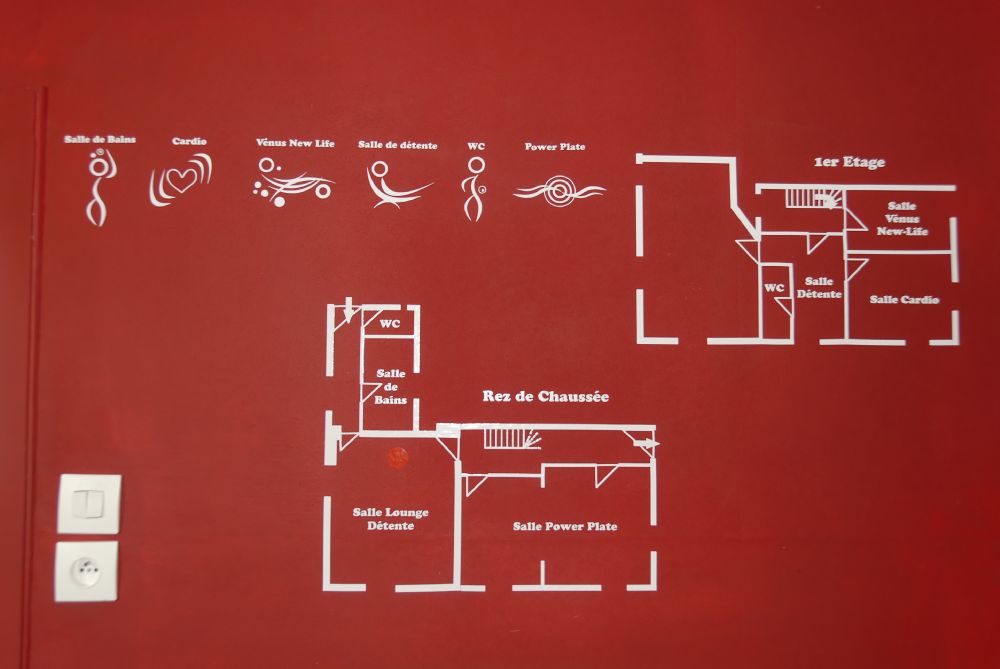 Le plan de situation blanc sur un mur rouge du centre de coaching sportif Écoute la Rivière à Waldighoffen.