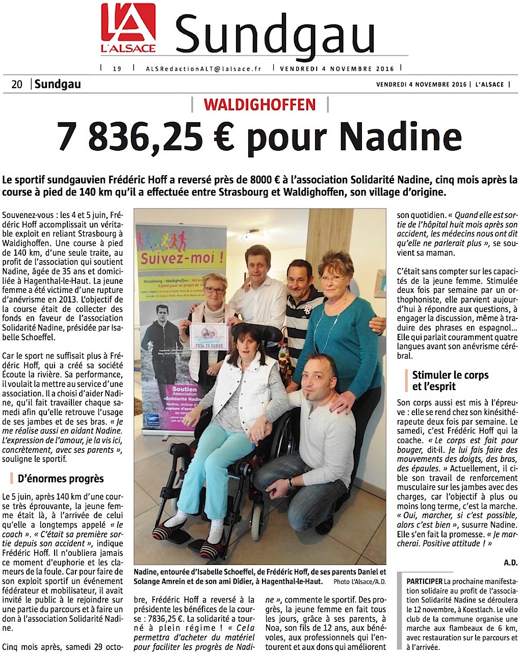 2016/11/04 - L'Alsace - 7836,25 € pour Nadine avec F. Hoff