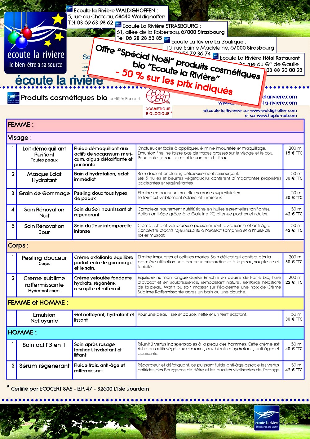 Promotion pour Noël chez "Ecoute la Rivière" à Waldighoffen pour les cosmétiques bio
