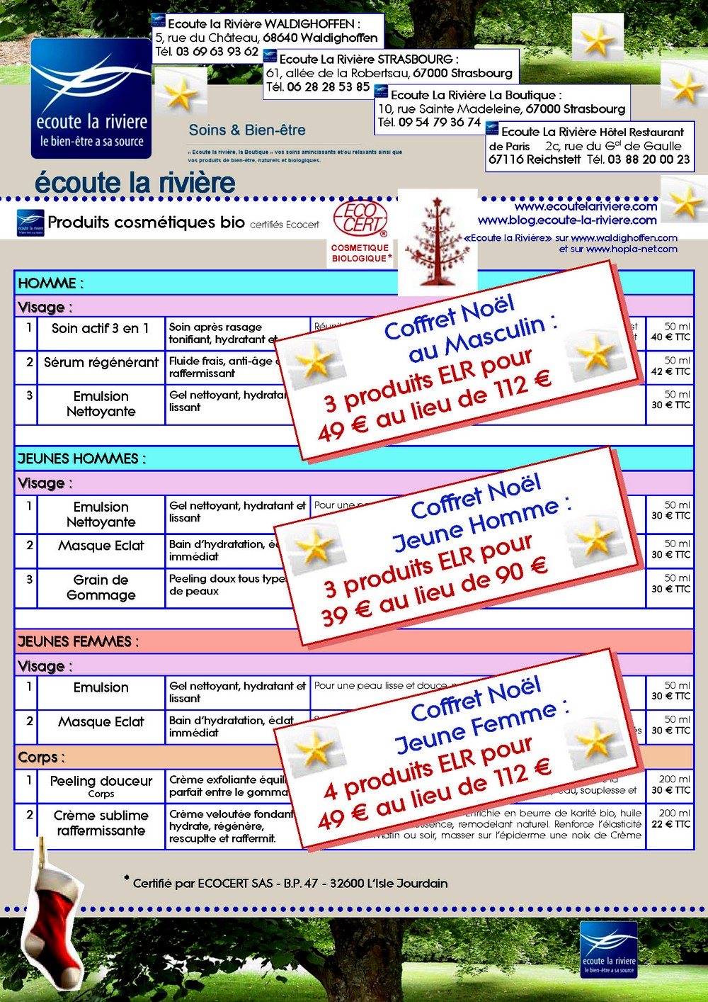 Liste des produits cosmétiques bio ELR et des prix habituels des produits et proposition de Noël pour les jeunes garçons et filles