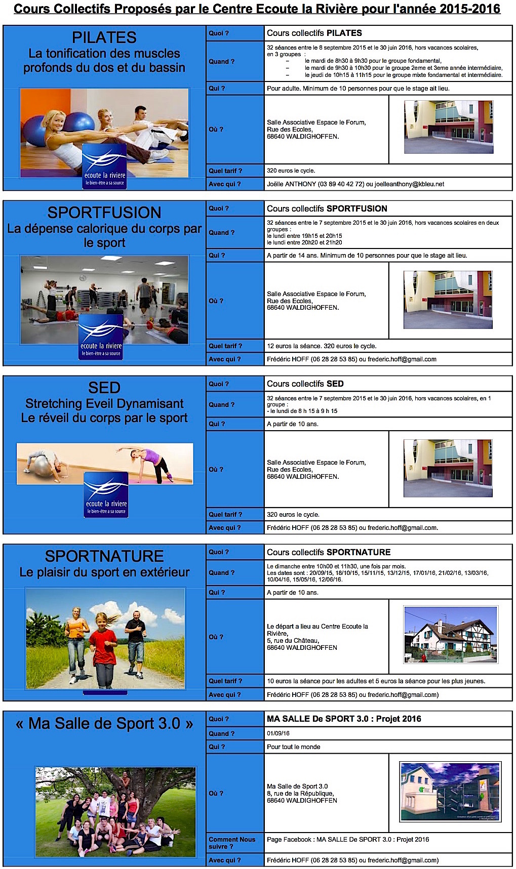 Programme des cours collectifs de Ecoute la Rivière pour 2015-2016