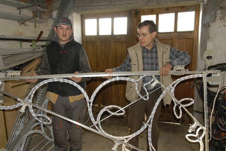 - Fabien Dietschy, ici à droite avec un de ses employé, s'occupe aussi de l'entretien des décorations de Noël des rues de Waldighoffen.