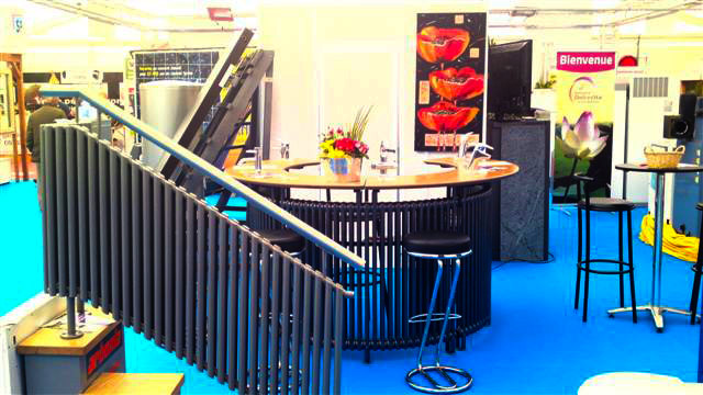 Des radiateurs d'un nouveau style intégrés dans des rambardes ou en dessous d'une table au stand Heinis à l'Expo Habitat de Waldighoffen.