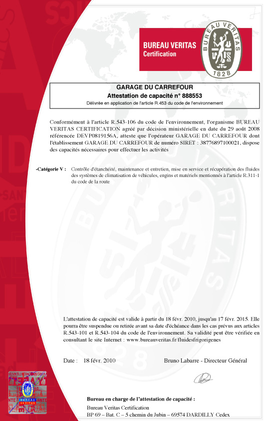 L'attestation de capacité à travailler sur les système de climatisation du Garage Dresch à Waldighoffen.