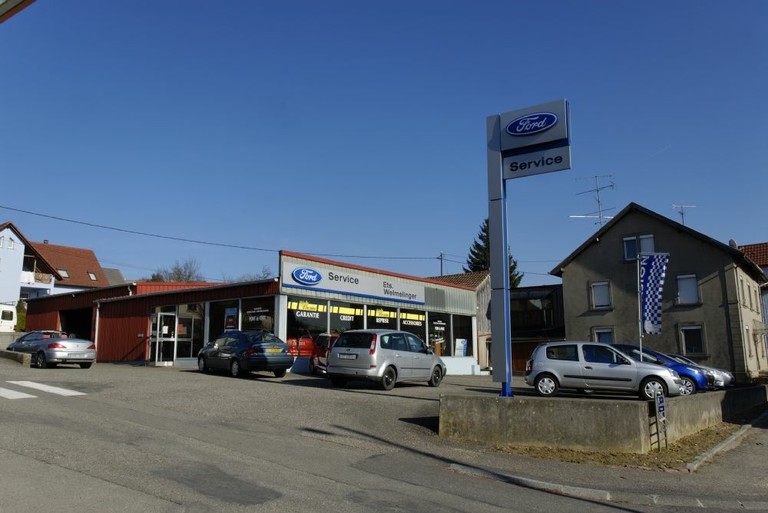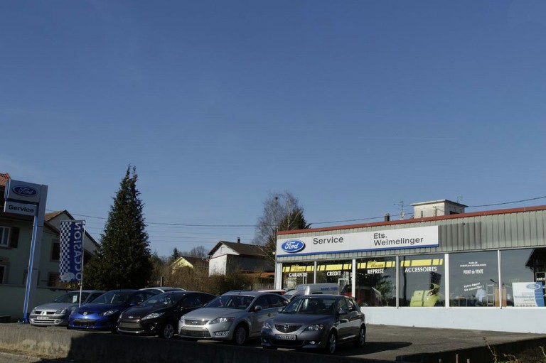 - Vue sur le Garage Welmelinger, avec son service Ford à Waldighoffen, avec des véhicules neufs et d'occasions exposés à l’avant.