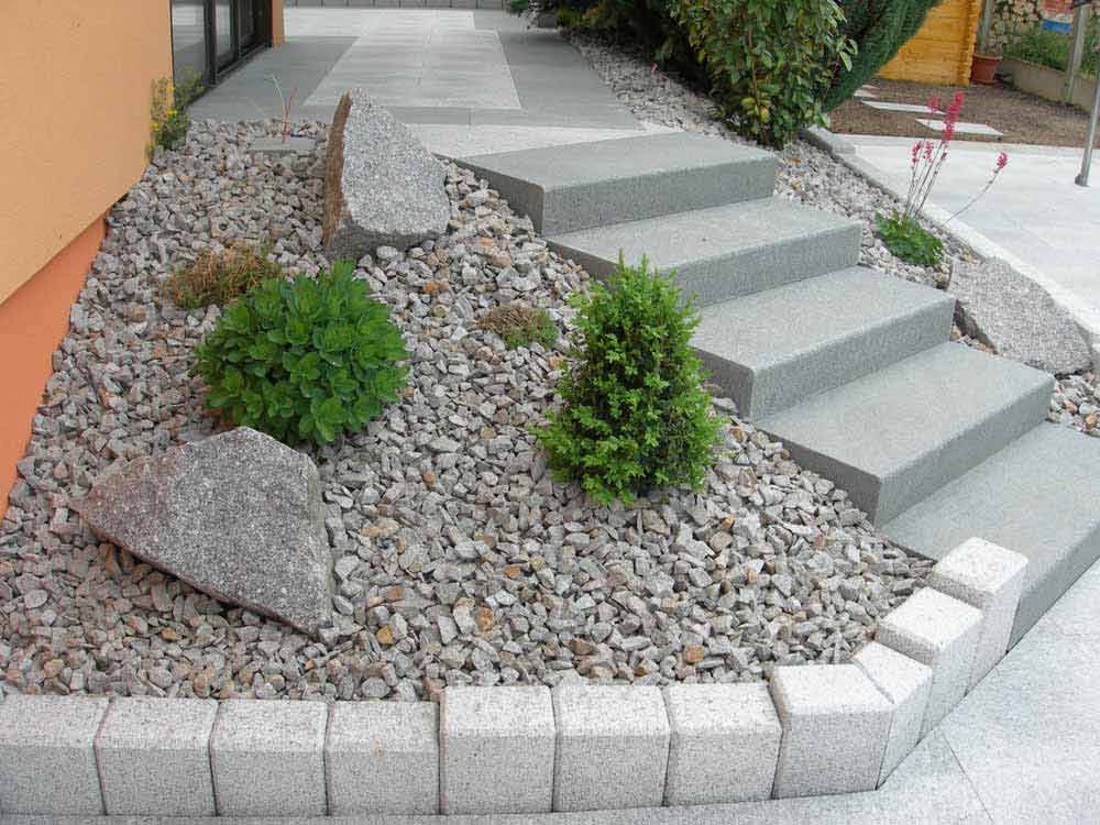 Descente de terrasse avec cinq marches en granit gris, escalier réalisé par Paysages Simon Michaël de Waldighoffen.