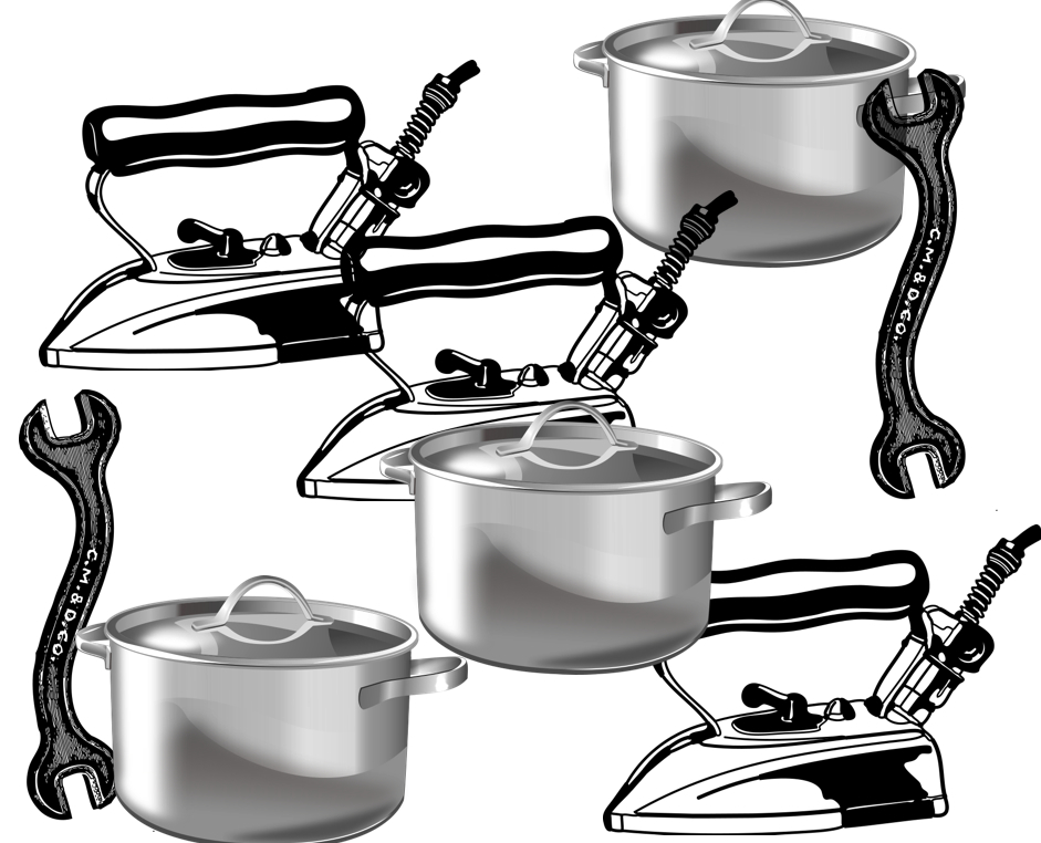 Dessins en noir et blanc de 3 casseroles, 3 fers à repasser et 2 clés à molettes disposés pèle-mèle sur une feuille.