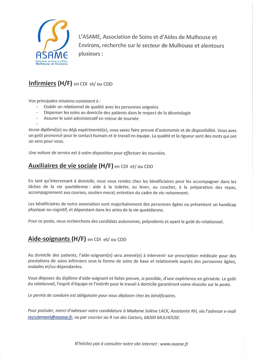 ASAME proposition d'emplois