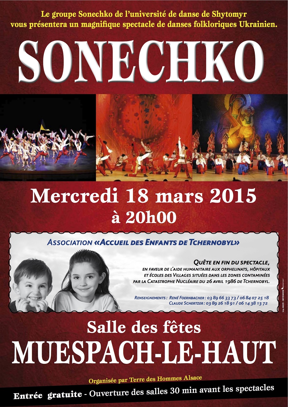 Affiche pour le spectacle de danse ukrainienne pour les enfants de Tchernobyl, le 18 mars 2015 à Muespach-le-haut.
