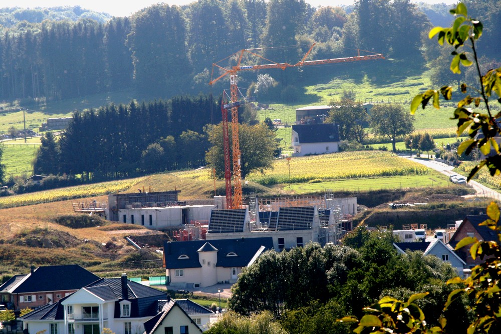 Photo zoomée du chantier de la maison médicalisée EHPAD de Waldighoffen dans le Sundgau, prise depuis le Sonnenglanz. A l'avant, les maisons de l'impasse Anne de Ramstein.