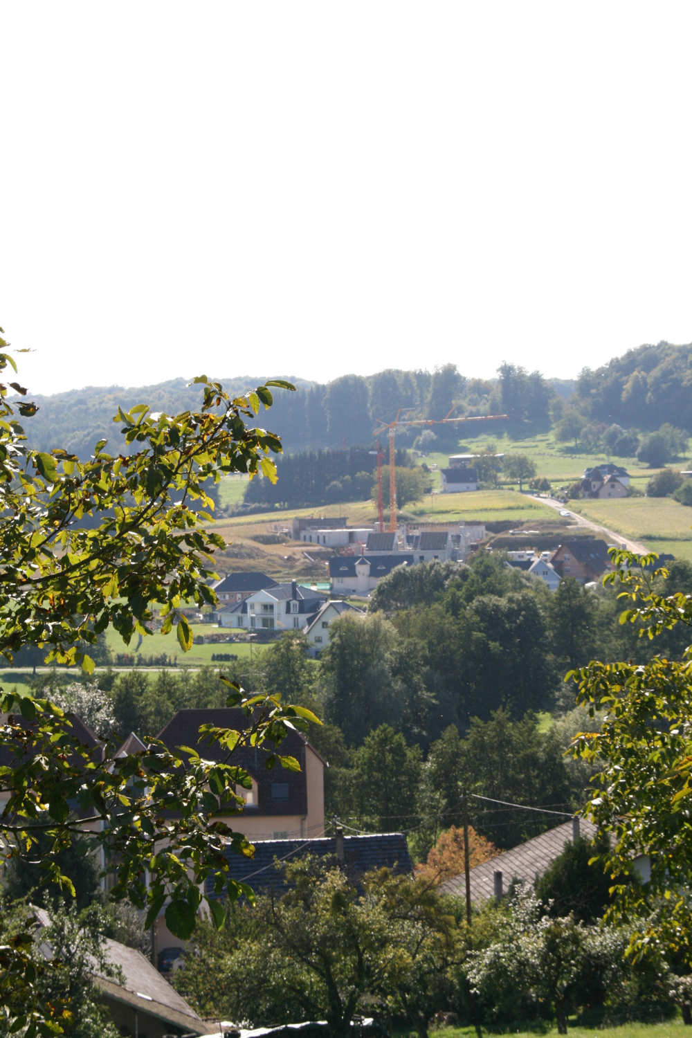 Photo depuis le Sonnenglanz de la maison médicalisée de Waldighoffen dans le Sundgau. En premier plan certaines maisons de la rue du Maréchal Joffre et juste derrière celles de l'impasse Anne de Ramstein.