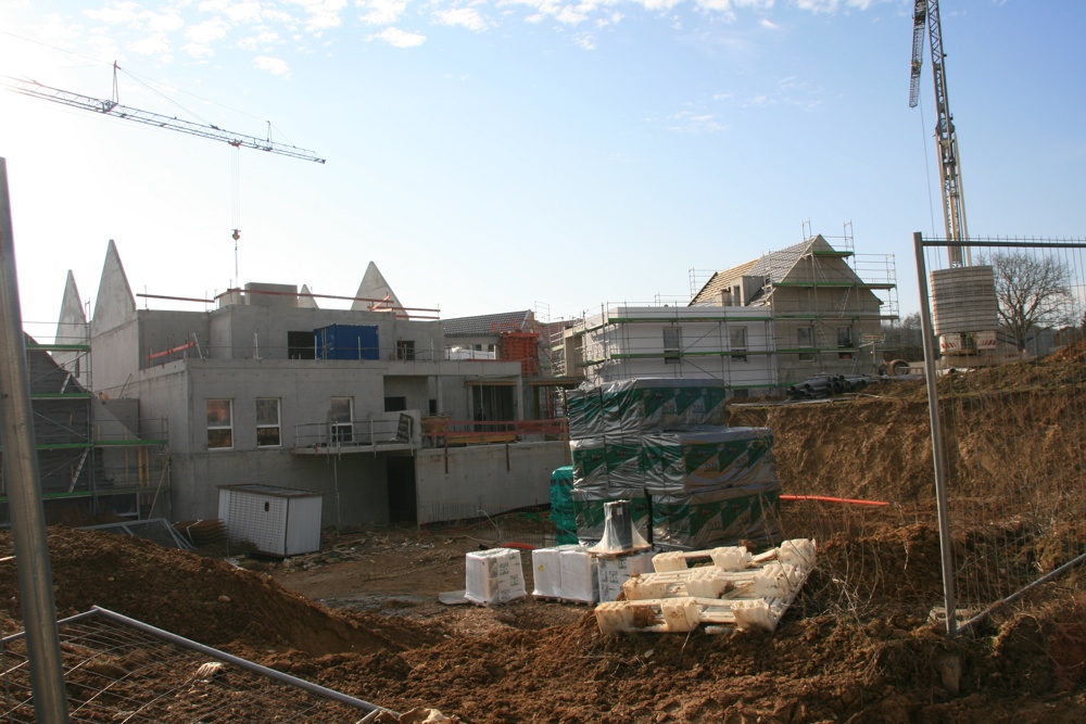 Le chantier de l'EHPAD à Waldighoffen sous un beau ciel bleu avec ses deux immenses grues en février 2011.