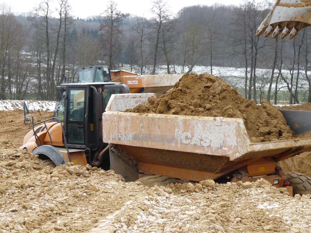 Photo du 10 mars 2010 montrant le chargement d'un camion tombereau chargé par de la terre pendant les travaux de terrassement du futur EHPAD à Waldighoffen (photo Joseph Haas)