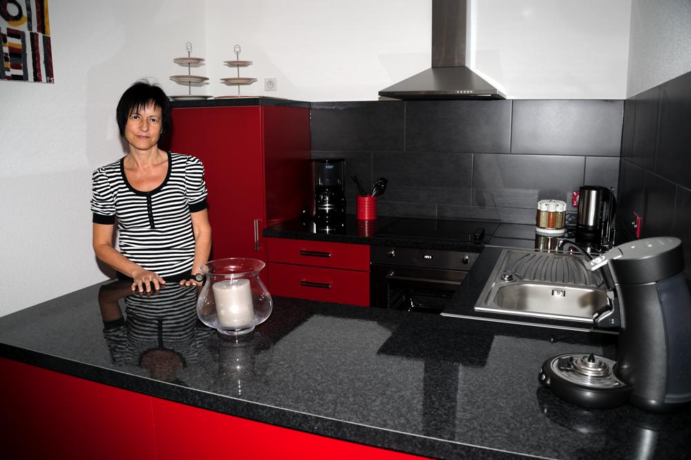 L'hôtesse du gîte Klei Paris à Waldighoffen, Doris Pitella pose dans la cuisine d'où elle prépare les petits-déjeuners et les dîners.