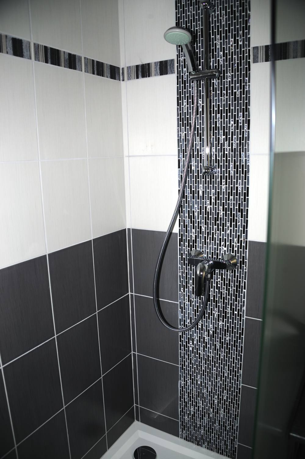 La douche mise à disposition avec la chambre violette du gîte Klei Paris à Waldighoffen. Des tons gris et blancs ont été choisit.