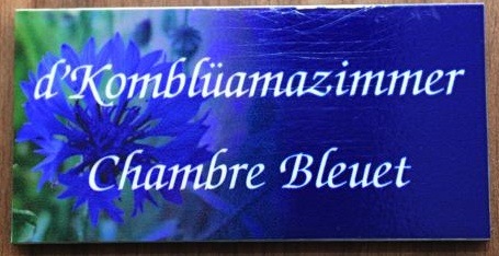 La petite plaquette collée sur la porte pur identifier la chambre Bleuets du gîte Klei Paris à Waldighoffen.