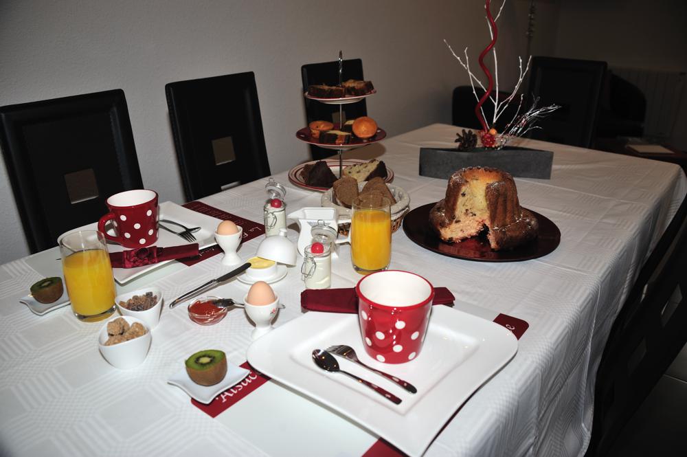 La table du petit-déjeuner, avec boissons chaudes, fruits et jus de fruits, gâteaux et pains variés du gîte Klei Paris à Waldighoffen.