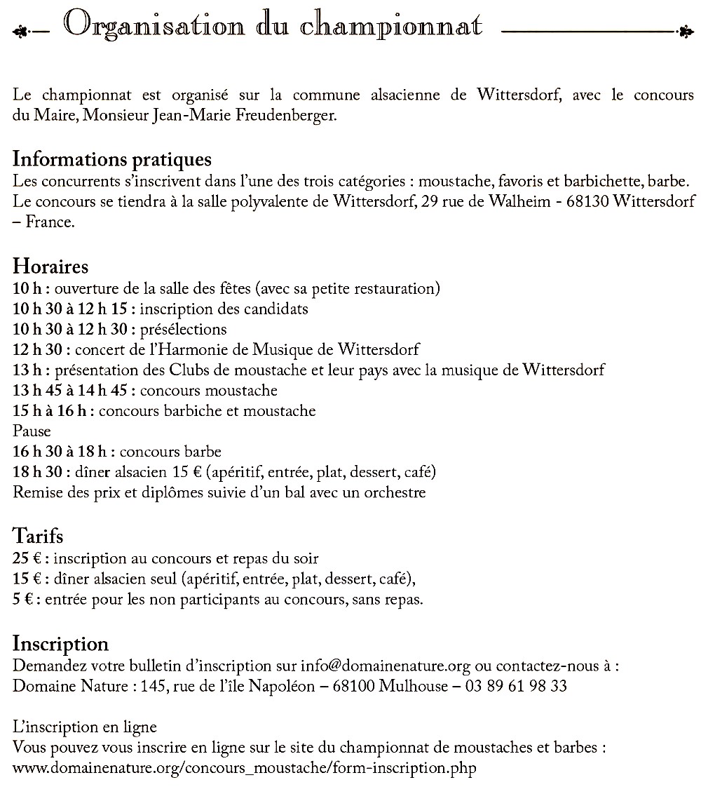 Championnat organisé le 22 septembre 2012 à Wittersdorf par Hervé Diebolt (habitant de Waldighoffen) et ses amis du Club de moustache d'Amberg et l'association Domaine Nature - Organisation pratique