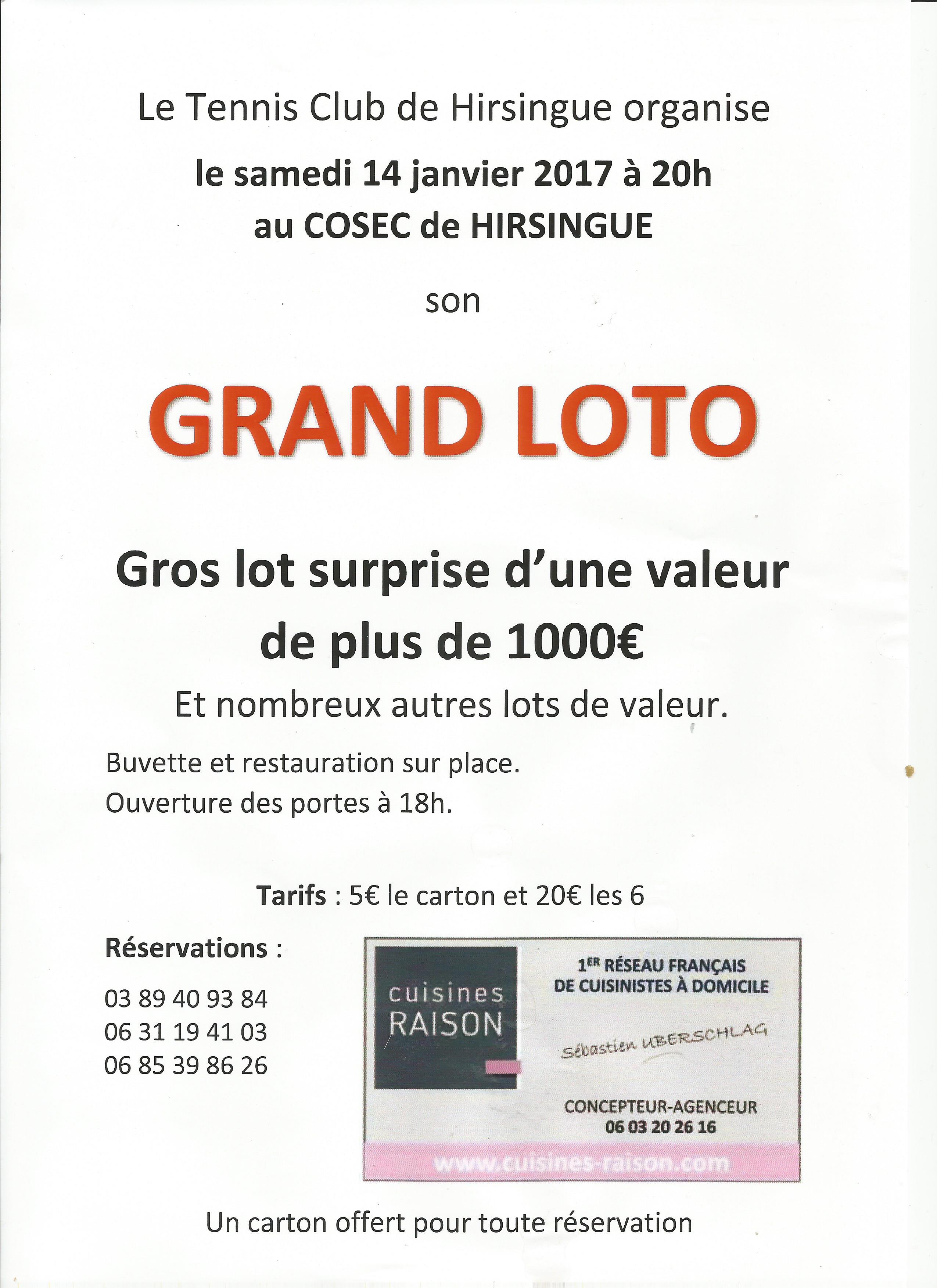 Le Tennis Club de Hirsingue organise le samedi 14 janvier 2017 à 20h au COSEC de HIRSINGUE son GRAND LOTO