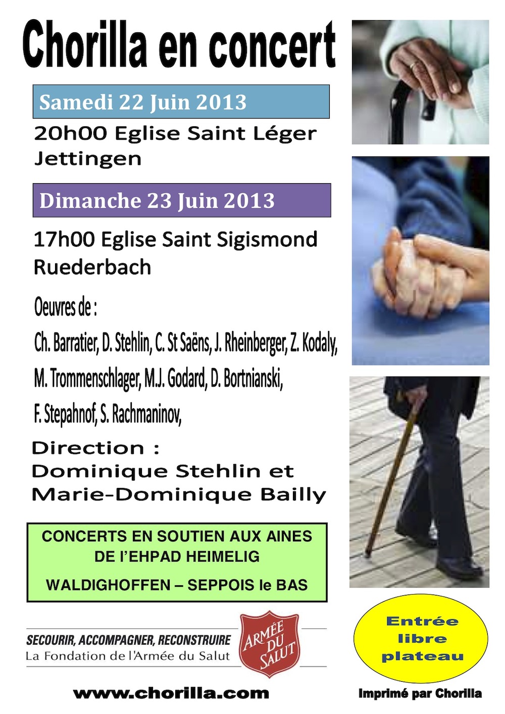 L'affiche annonçant les 2 concerts donnés par Chorilla en soutien aux aînés des résidences EHPAD de Waldighoffen et Seppois le Bas les 22 et 23 juin 2013.