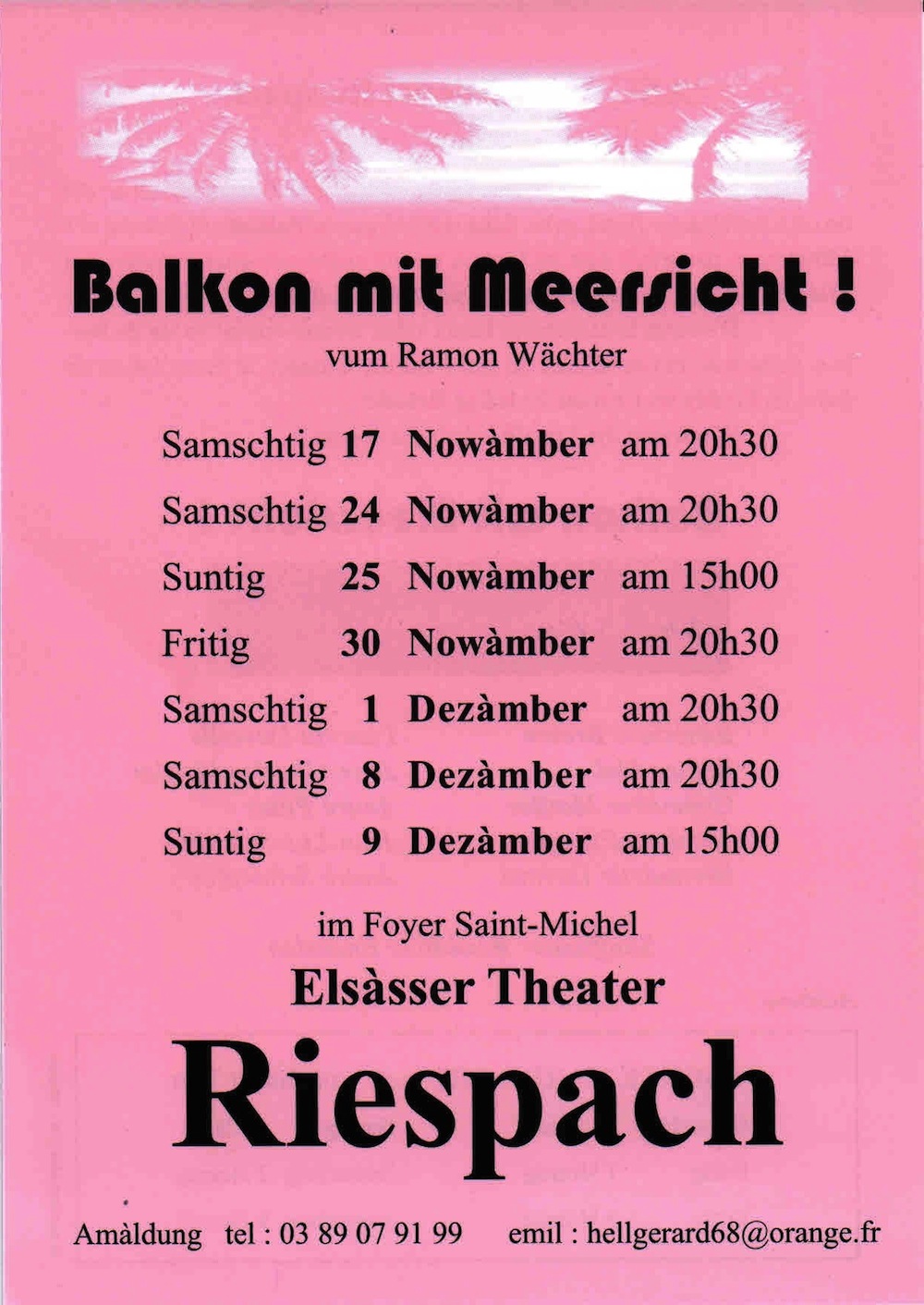 Affiche du spectacle 2012 de la troupe de théatre alsacien de Riespach en novembre et décembre 2012 au foyer Saint Michel.