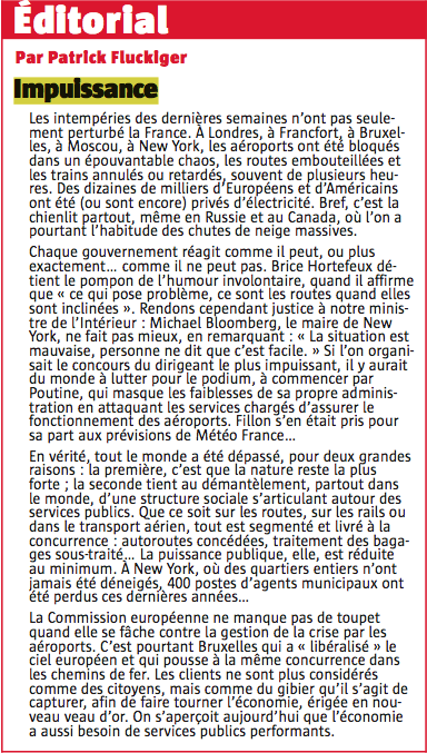 Éditorial intitulé " Impuissance " écrit par Patrick Fluckiger et paru dans le journal l'Alsace le jeudi 30 décembre 2010.