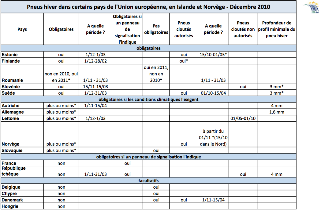 La première partie du tableau comparatif sur les pneus neige dans différents pays.