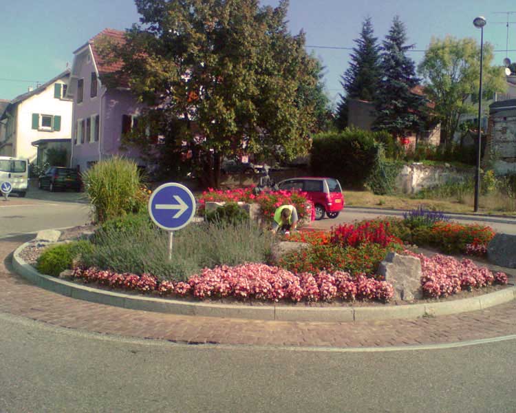 Un nouveau rond point fleuri à Waldighoffen, avec une fontaine, dont le bassin est taillé dans une seule pierre, et sa statue.