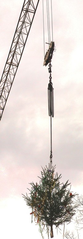 La grue installe le sapin sur le Forum en travaux