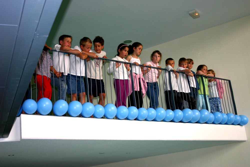 Le jour de l'inauguration des bâtiments du Forum, les enfants sur la mezzanine de la médiathèque.