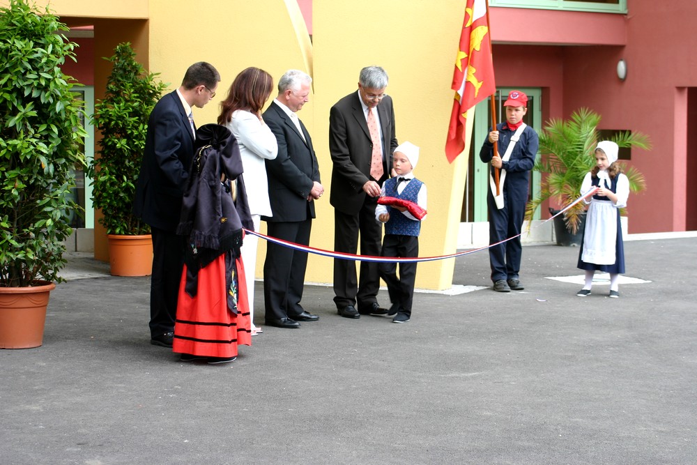 De gauche à droite, le sous-préfet de l'époque Jérôme Normand, la sénatrice Catherine Troendlé, le président du Conseil Général Charles Buttner, le maire Henri Hoff et les jeunes.