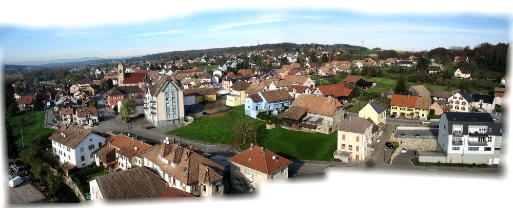 Photo panoramique montrant une partie de Waldighoffen depuis le haut de la cheminée