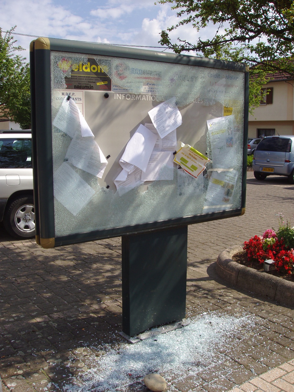La vitre du panneau d'affichage place Jeanne d'Arc à Waldighoffen brisé.