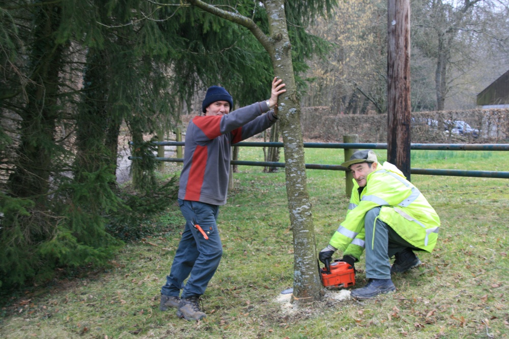 Pascal Capitaine et Christian Kubler ouvriers communaux de Waldighoffen coupe un arbre du Sonnenglantz à la tronçonneuse.