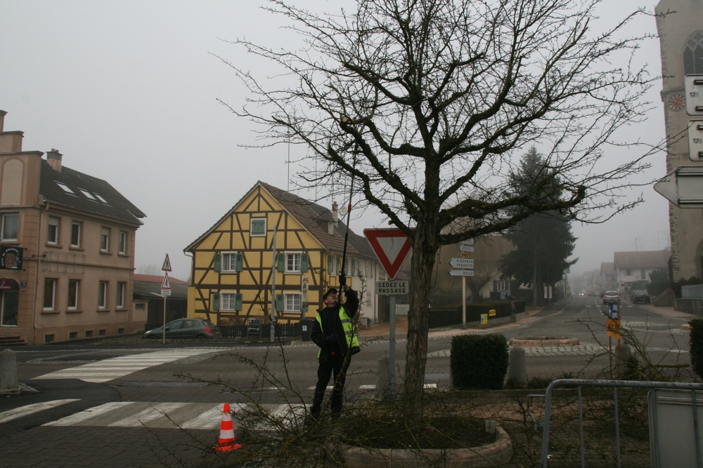 Philippe Schmidlin chef des ouvriers communaux entrain d'élaguer un des arbre se trouvant sur la Place de la Mairie de Waldighoffen.