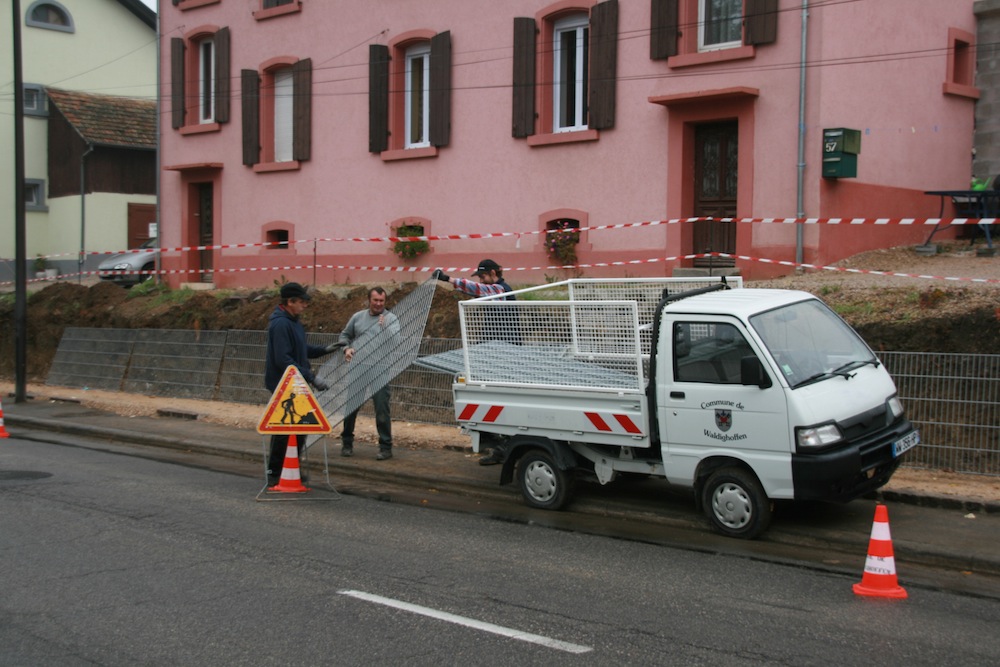 Philippe, Pascal et Fabrice occupés à décharger les grilles des cages à gabions, en cours de montage à la cité Lang à Waldighoffen. Novembre 2011.