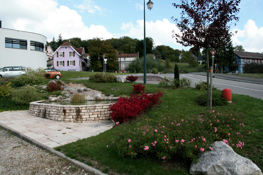 La fontaine de la rue Emanuel Lang à Waldighoffen et l'aménagement fait autour de roses, arbustes rouges, etc.