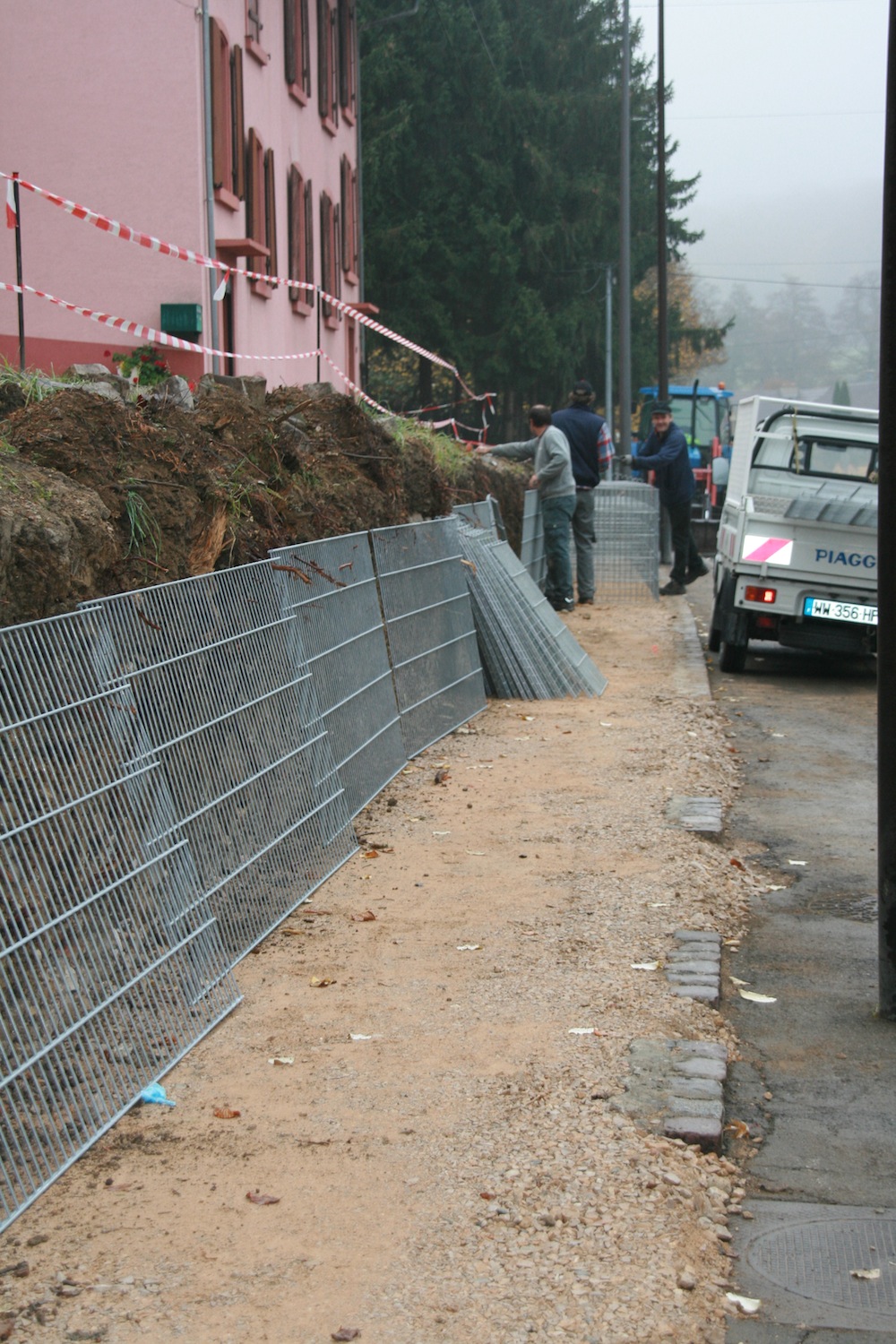 3 des 4 ouvriers communaux en plein montage des cages à gabions dans le rue du Maréchal Joffre à Waldighoffen en novembre 2011.