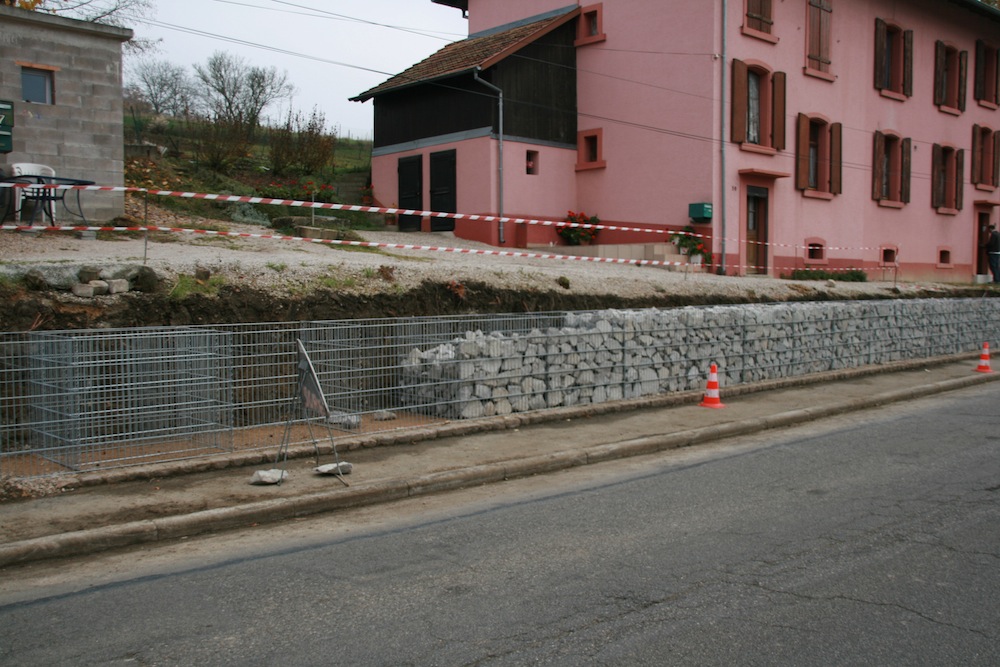 La première partie du mur en gabion dans la rue du Maréchal Joffre à Waldighoffen est terminée.