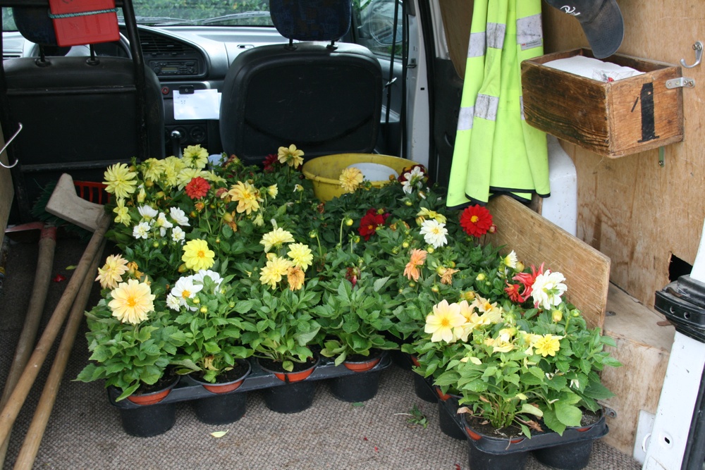 Les dahlias dans le coffre de la voiture des ouvriers de Waldighoffen