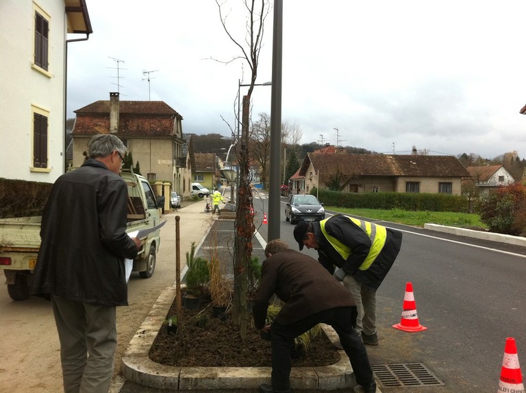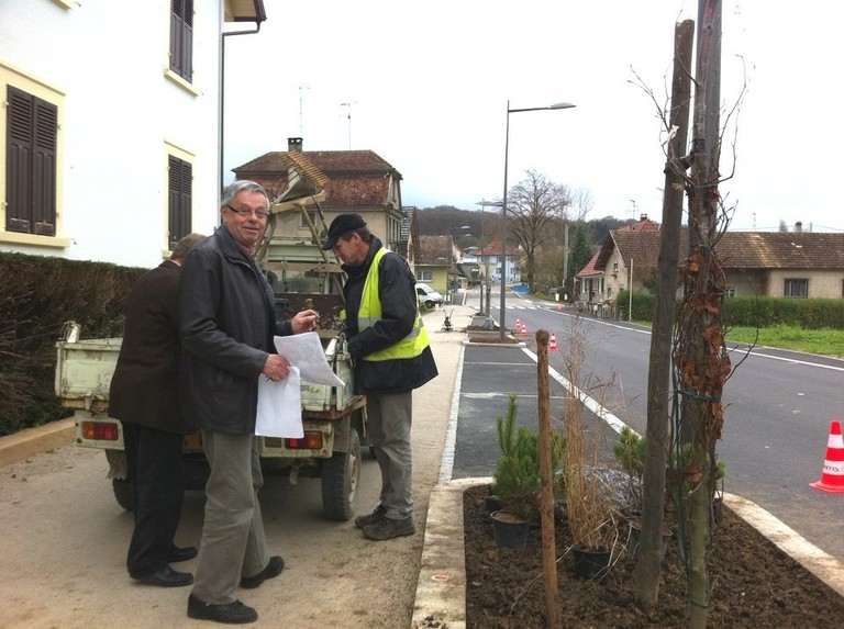 - Monsieur le maire avec les plans des nouvelles plantations à la main accompagné de son 1er adjoint Guy Eggenspieler et Philippe Schmidlin ouvrier communal, rue du 19 novembre à Waldighoffen.