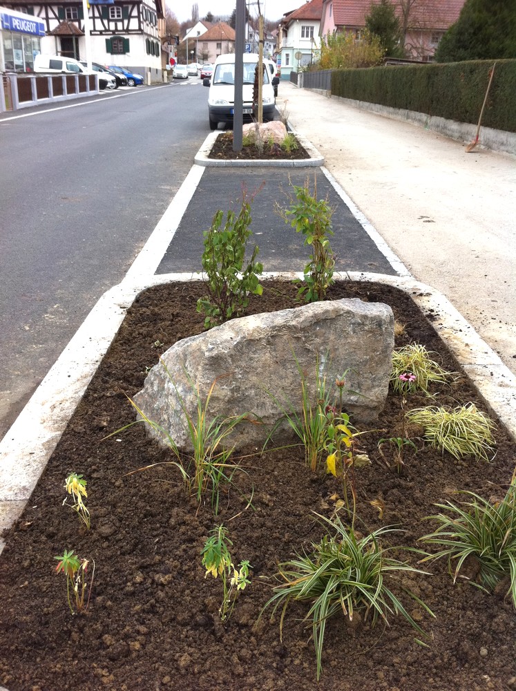 - Nouveau parterre de massifs agrémenté d'une grosse pierre décorative rue du 19 novembre, dans la commune de Waldighoffen dans le Sundgau.