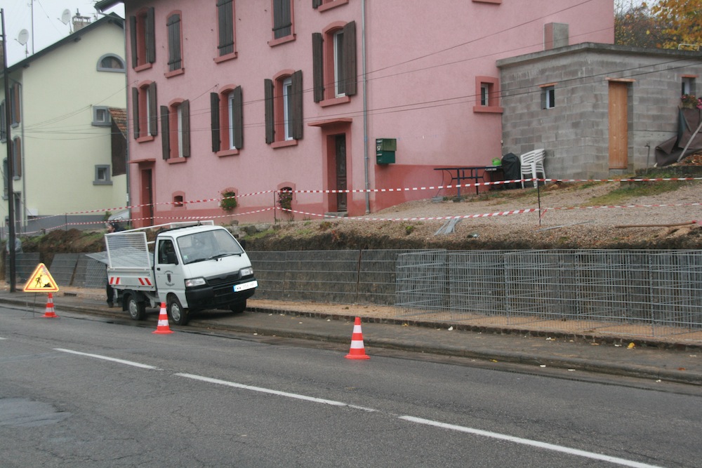 Photo globale du chantier de la rue du Maréchal Joffre à Waldighoffen, en novembre 2011, de pose de murs en gabions par les ouvriers communaux.